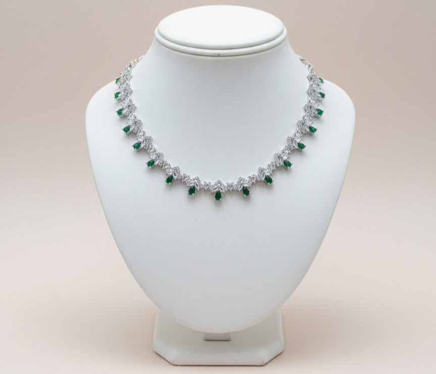 Emerald Green & Cubic Zirconia Drop Necklace Set - Silver Plated, Adjustable