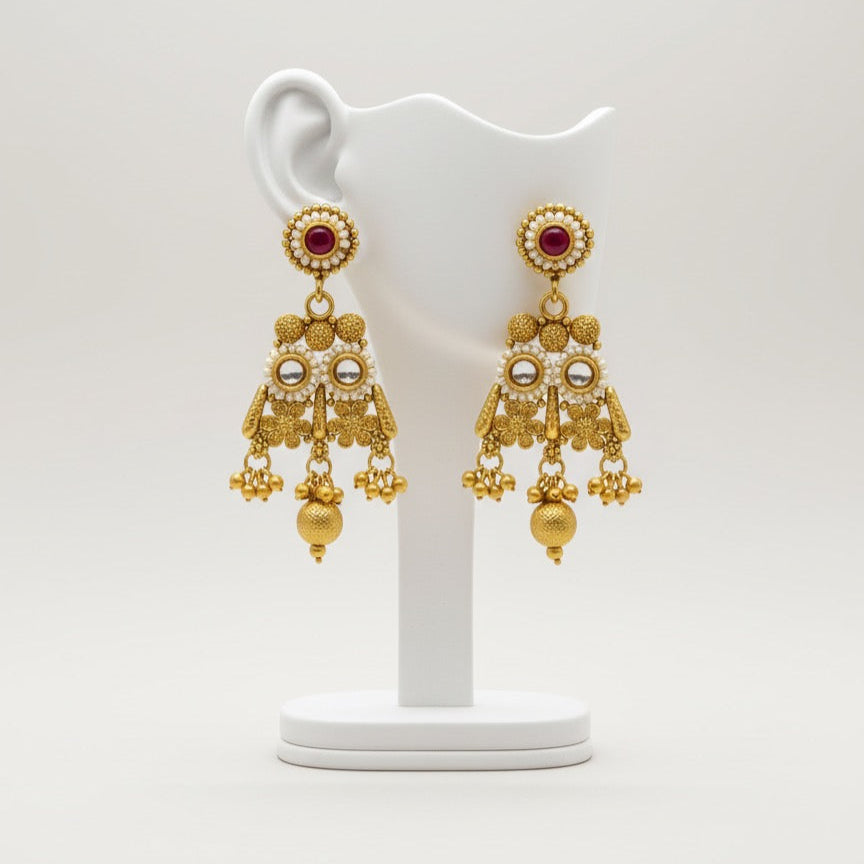 Gold-Plated Necklace, Jhumka Earrings & Maang Tikka Set – Traditional Red & White Stone Design with Pearl Detailing