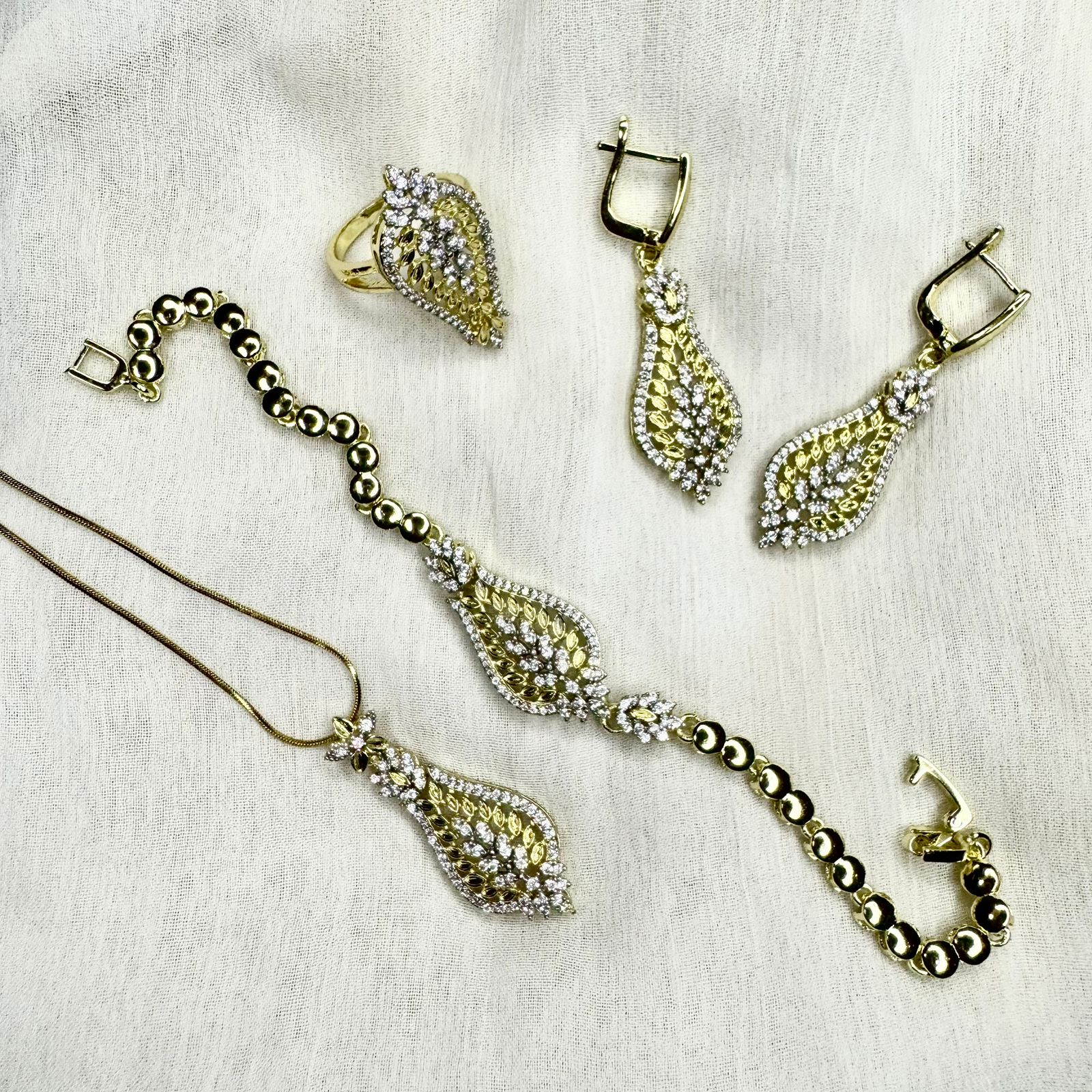 Add a touch of shine to your look with this gold finish cubic zirconia jewelry set. It includes a necklace, bracelet, earrings, and a matching ring — all made to stand out beautifully.