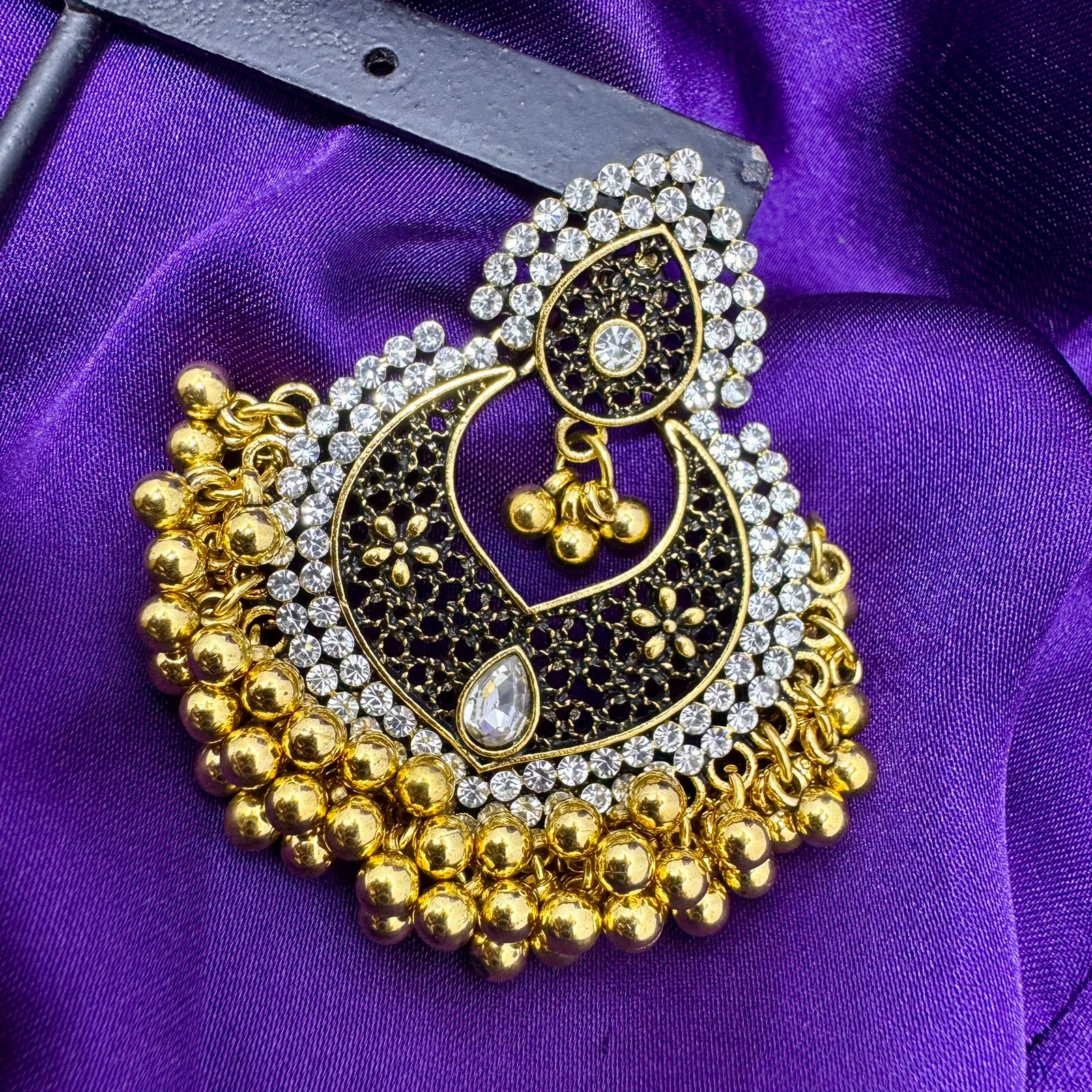 - Traditional Chandbali Style: Features a popular crescent moon (Chandbali) upper design with a classic Jhumka dome shape, embellished with hanging metallic ghoonghros.