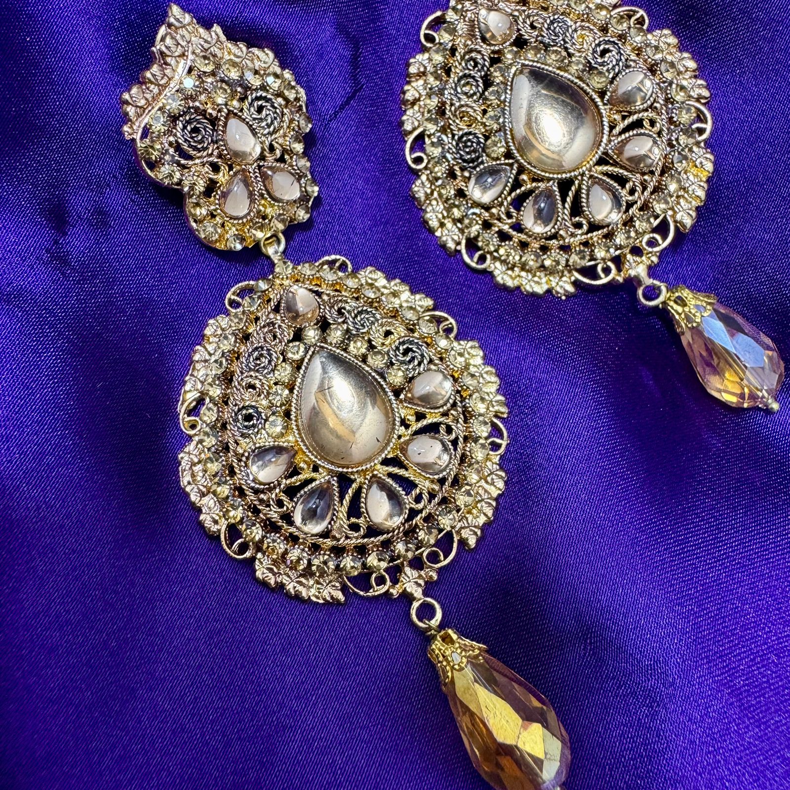 Adorn yourself with the luxurious sparkle of these Premium Gold-Toned Kundan Dangle Earrings. Drawing inspiration from classic Indian and Pakistani jewelry styles, these statement earrings blend intricate craftsmanship with a sophisticated, antique finish. They are designed to be the focal point of any traditional or semi-formal ensemble, offering both grandeur and grace. The stunning multi-layered design, featuring a top stud and a magnificent chandelier-style base, culminates in a captivating champagne-colored teardrop that catches the light beautifully.